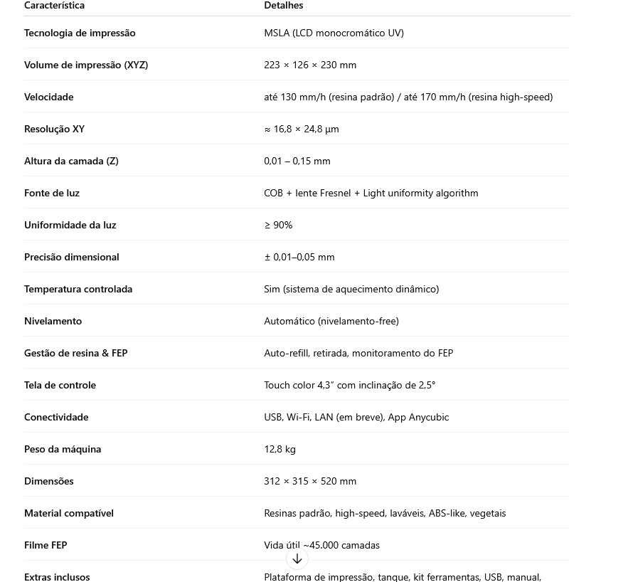 Velocidade surpreendente: até 130 mm/h com resina padrão e incríveis 170 mm/h com resina de alta velocidade (0,1 mm de camada) — um dos modelos mais rápidos do mercado.